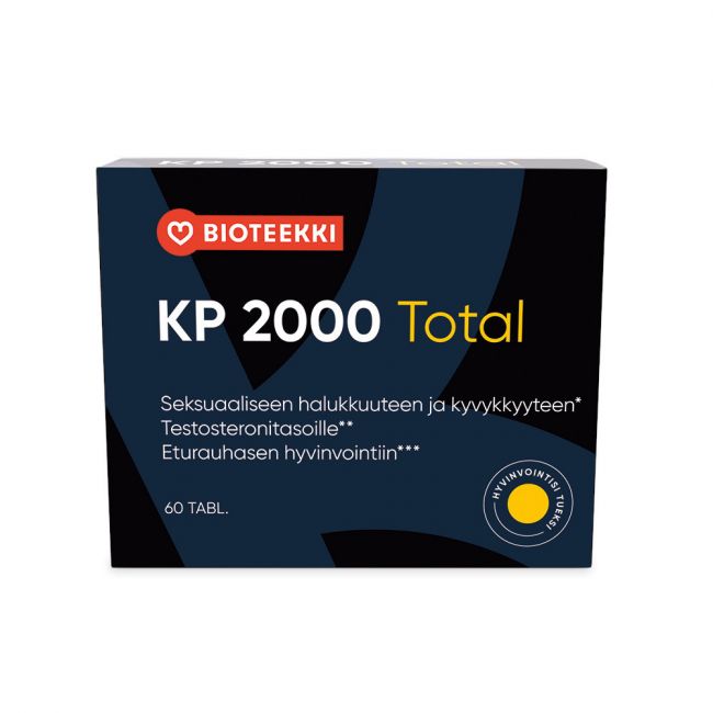 KP 2000 Total on kokonaisvaltaisesti vaikuttava luontainen vaihtoehto miehisen suorituskyvyn lisäämiseen. Se on kehitetty KP 2000 Super -valmisteen pohjalta. Vahvempi ja monipuolisempi KP 2000 Total sisältää muiden ainesosien lisäksi aminohappo arginiinia sekä tribulus- ja withania-uutetta.
