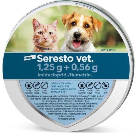 Seresto vet harmaa, hajuton panta (38 cm, 12,5 g) sisältää vaikuttavana aineena 1,25 g imidaklopridia ja 0,56 g flumetriinia. Valmistetta käytetään koirien ja kissojen kirpputartuntojen hoitoon ja ennaltaehkäisyyn sekä koirille väivetartuntojen hoitoon. Valmisteella on koirille ja kissoille 8 kuukautta kestävä puutiaisia tappava vaikutus tai puutiaisia karkottava vaikutus puutiaislajista riippuen (katso pakkauselosteesta tarkemmat tiedot). Ei alle 7 viikon ikäisille koiranpennuille eikä alle 10 viikon ikäisille kissanpennuille.